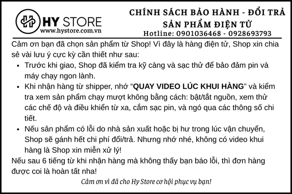 Khách hàng có trách nhiệm trình giấy tờ liên quan chứng minh sự thiếu sót trên để hoàn thành việc hoàn trả/đổi trả hàng hóa. Và hàng hóa đổi trả phải còn nguyên vẹn, không qua sử dụng. Chúng tôi sẽ không chấp nhận đổi trả hàng hóa nếu là lổi đặt sai phân loại từ Khách hàng. Khách hàng cần có clip quay cảnh khui hàng. Yêu cầu trong clip có đầy đủ mã vận đơn, và tổng quan bên ngoài gói hàng trước, khi mở gói hàng, clip phải đầy đủ không cắt ghép,... Nếu không có clip, Hystore.com.vn xin từ chối giải quyết mọi khiếu nại.
