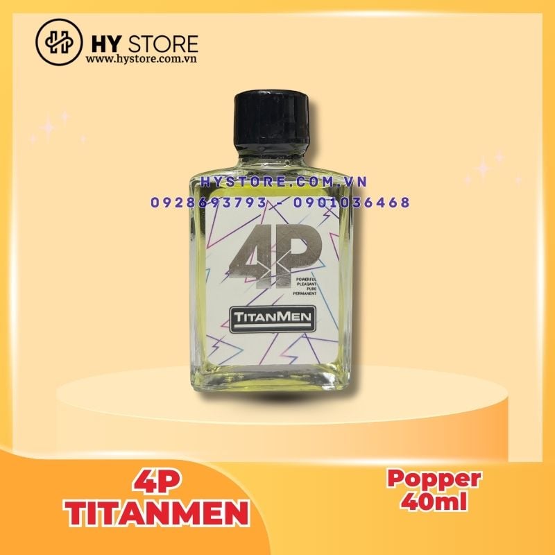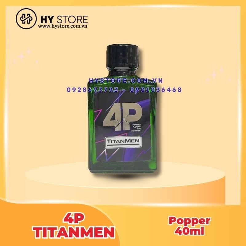 Giới thiệu về Popper 4P Titanmen loại cao cấp - 40ml thường được sử dụng như sản phẩm hỗ trợ kích thích tình dục, tăng cường khả năng cực khoái, giảm đau rát khi quan hệ qua đường hậu môn, chuyên dụng cho các cặp đôi đồng tính nam. Sử dụng Popper 4P Titanmen loại cao cấp - 40ml sẽ làm cho cơ trơn xung quanh các mạch máu và bó cơ để hoàn toàn thư giãn, sau khi cơ bắp thư giãn, nó sẽ làm cho mạch máu tăng lưu lượng máu trong cơ thể và tỷ lệ nhịp tim. Đồng thời nó sẽ làm cho cơ thể có cảm giác lâng lâng, sung mãn kéo dài trong vài phút.